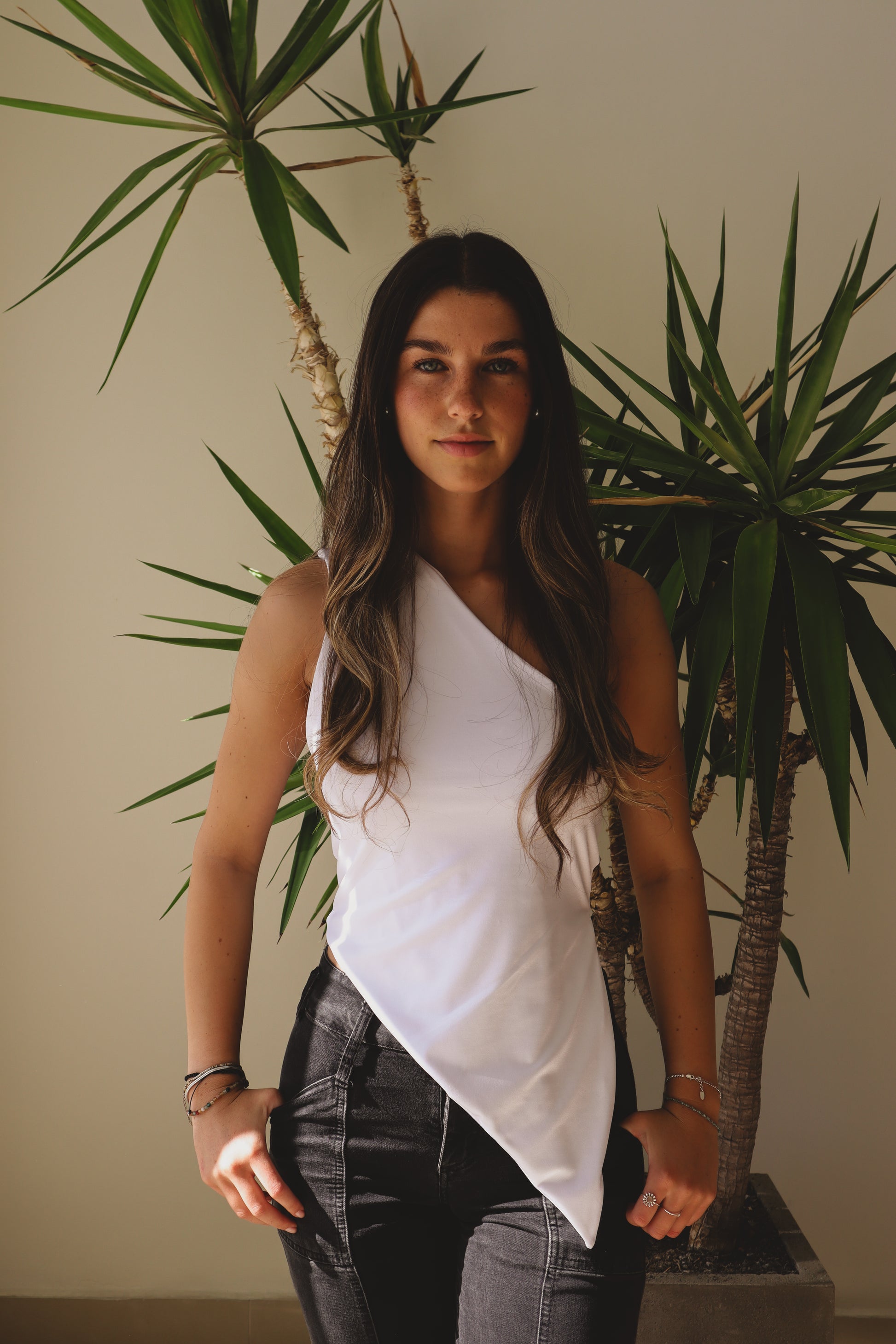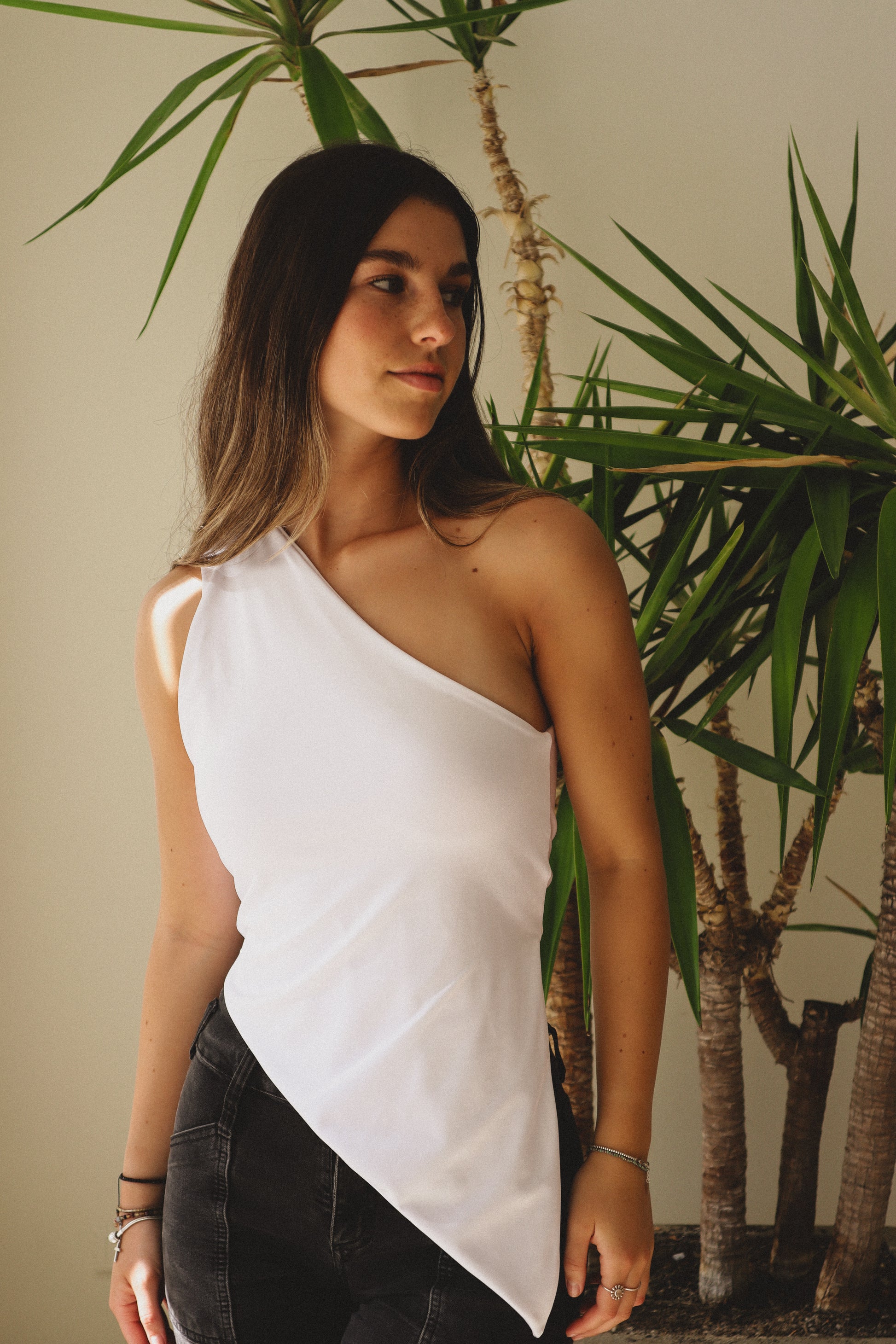 Top elasticado, con un hombro y bajo en punta. Espalda recta.