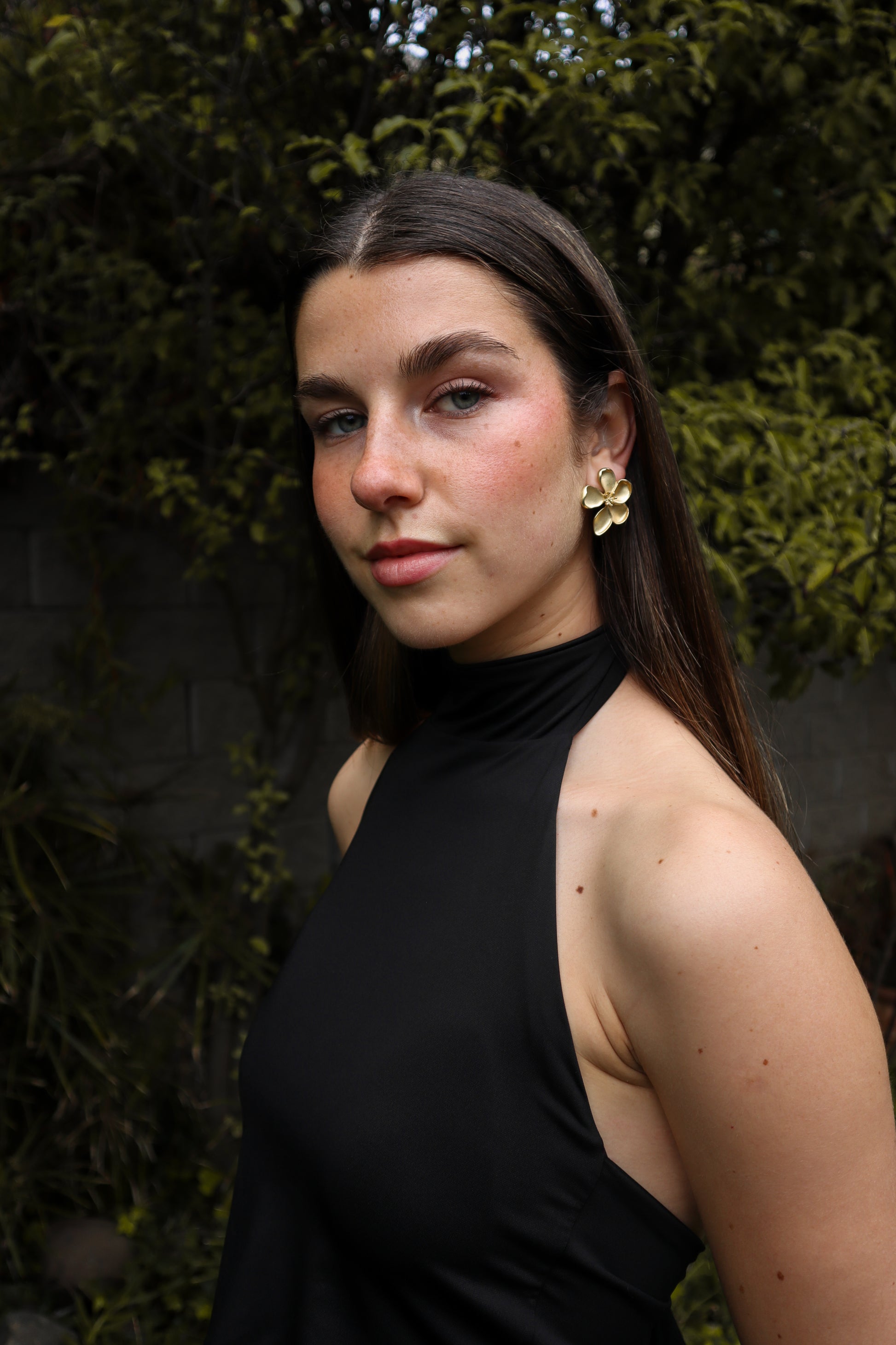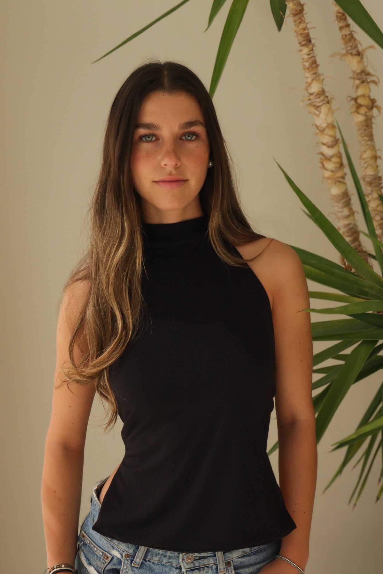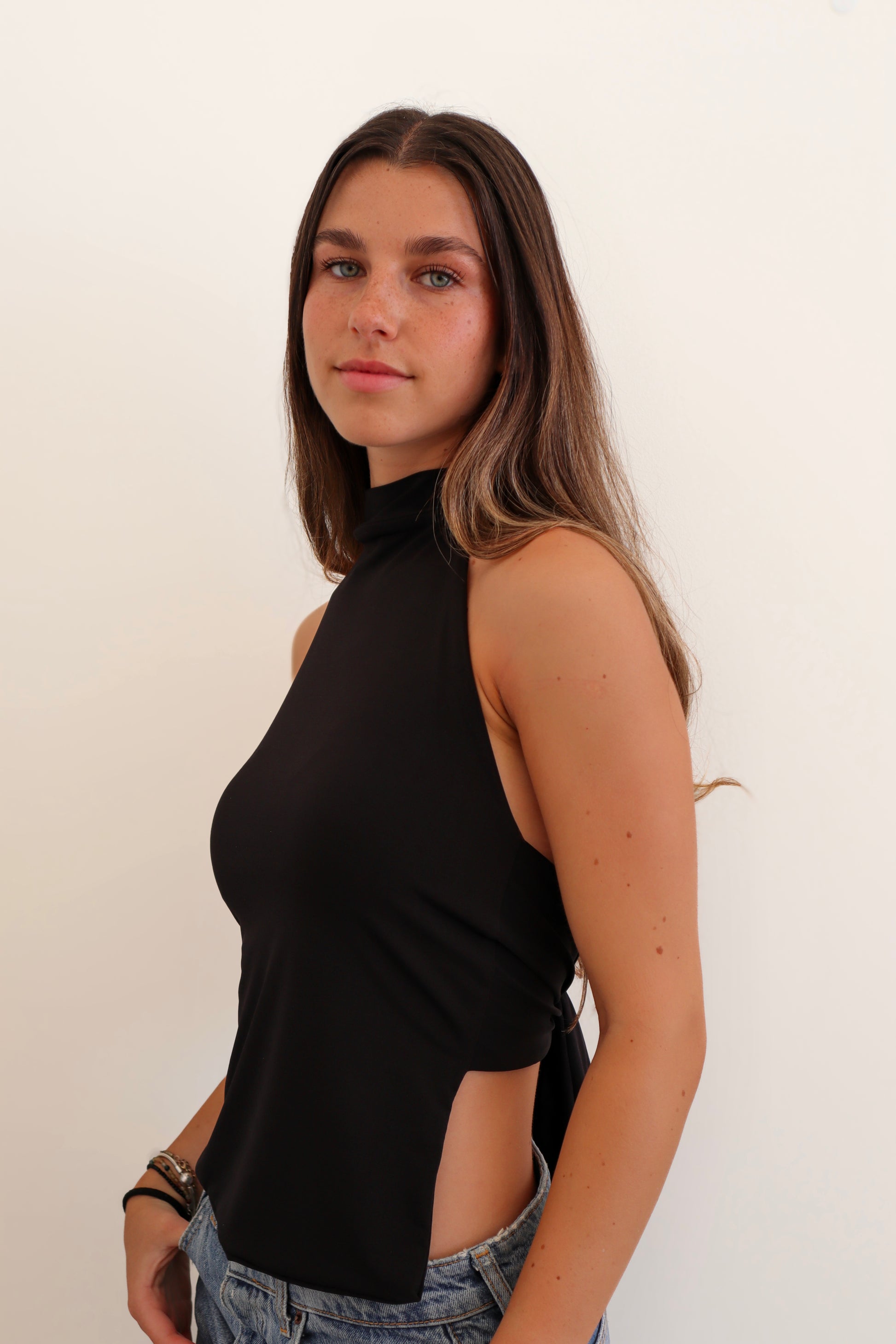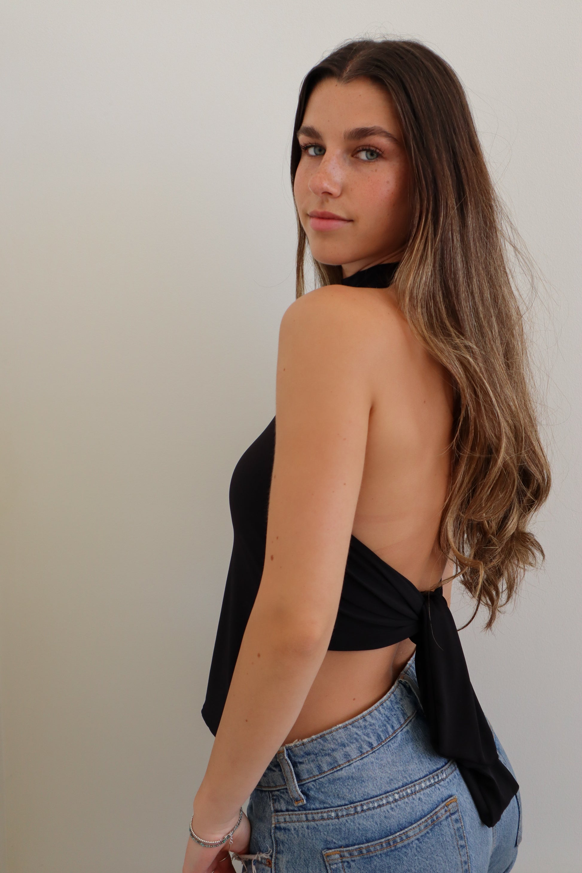 Top halter de lycra, se ata alrededor del cuello con un nudo y cuenta con un lazo regulable para ajustar en la espalda baja.