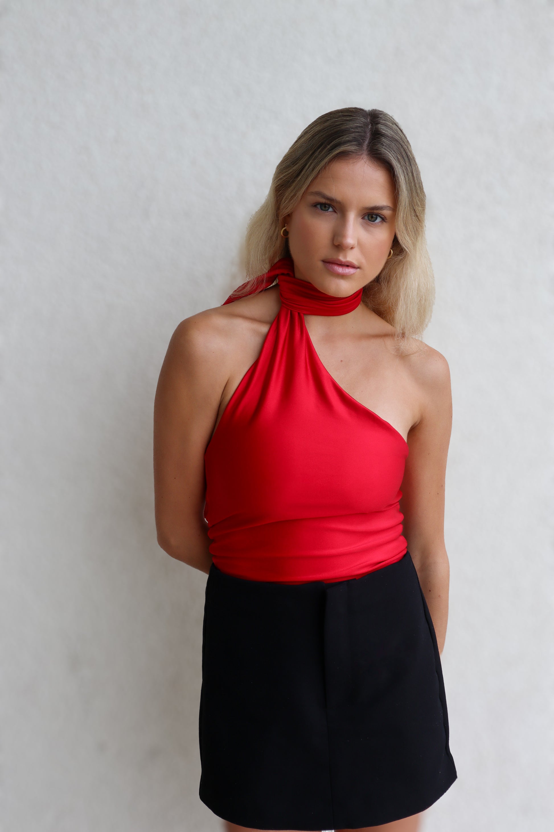 Top asimétrico con amarra en el cuello ajustable, tiene una espalda con corte recto.